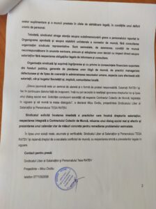 Sindicatul solicită încetarea imediată a practicilor care încalcă drepturile salariaților, respectarea Contractului Colectiv de Muncă, reluarea unui dialog social real și prezentarea unui calendar clar de măsuri concrete pentru remedierea problemelor.