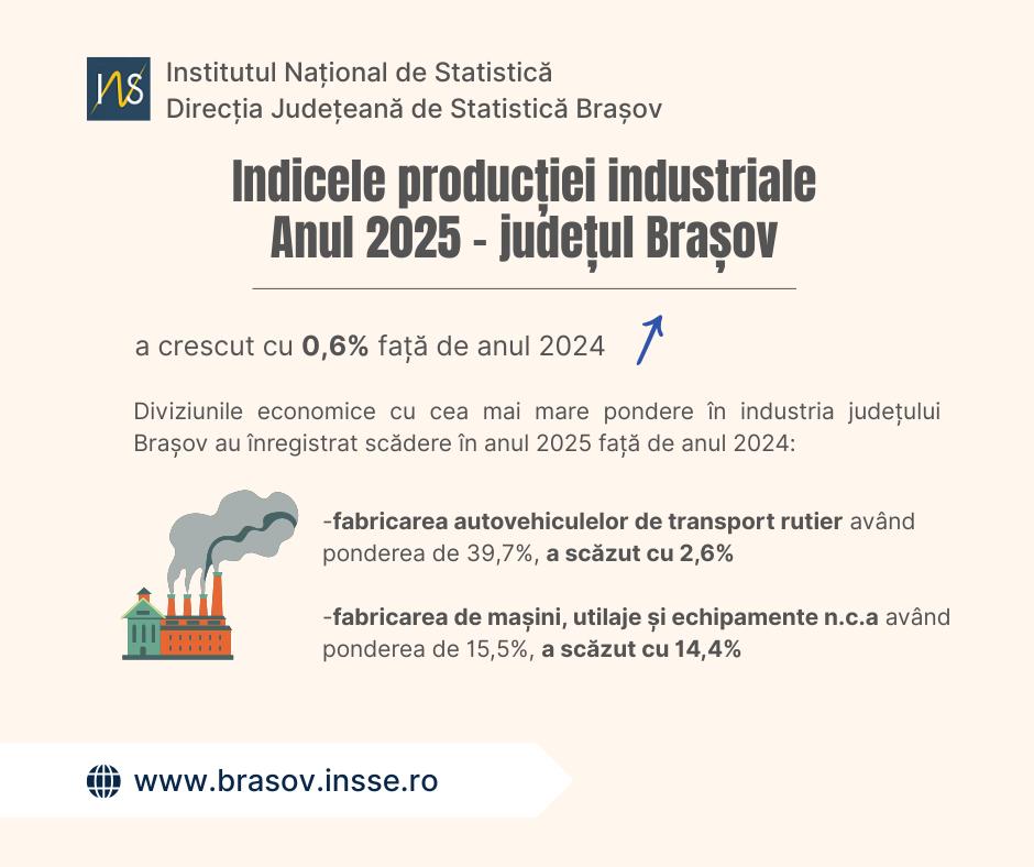 Producția industrială a diviziunii fabricarea autovehiculelor de transport rutier, avand ponderea de 39,7% în anul 2025, a fost mai mică cu 2,6% decât valoarea producției realizate în anul 2024.