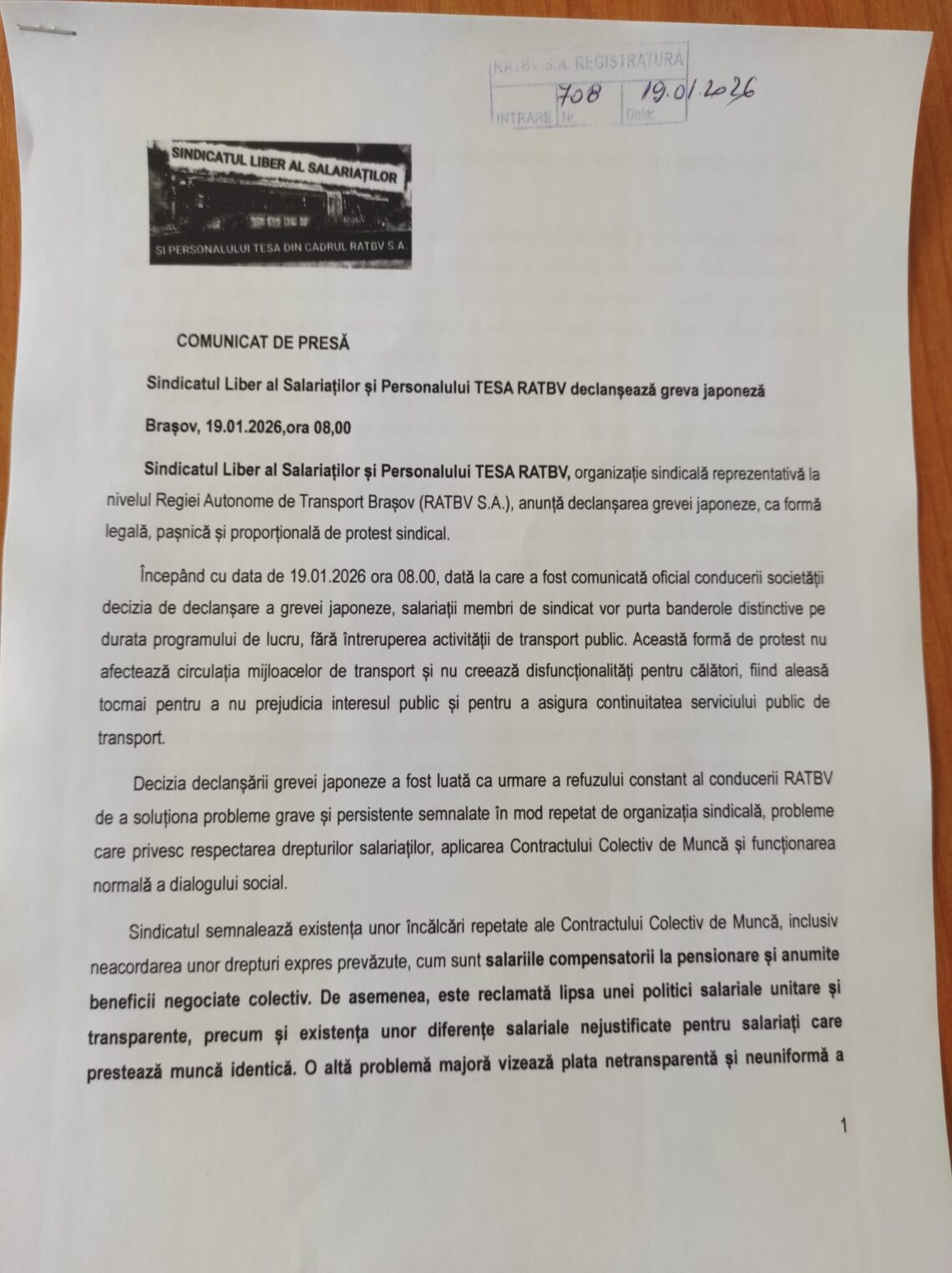 Astăzi, luni 19 ianuarie, Sindicatul Liber al Salariaților și Personalului TESA RATBV, organizație sindicală reprezentativă la nivelul Regiei Autonome de Transport Brașov (RATBV S.A.), a anunțat declanșarea grevei japoneze. Decizia a intrat în vigoare astăzi la ora 08:00, data la care a fost comunicată oficial conducerii societății și implicit primarului George Scripcaru. Membrii de sindicat vor purta banderole distinctive pe durata programului de lucru, însă activitatea de transport public nu va fi afectată. Președintele Sindicatului Liber al Salariaților și Personalului TESA RATBV, Micu Ovidiu, susține faptul că: „Greva japoneză este un semnal de alarmă și o formă de protest responsabilă. Salariații…